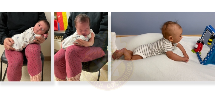View tutorial videos from Madigan’s Department of Pediatrics by clicking on the images below. Videos include strategies for optimizing tummy time, rolling, full neck movement all directions, visual tracking, reaching, grasping, transitioning to sit, and optimal positioning for social engagement for young babies starting from birth.