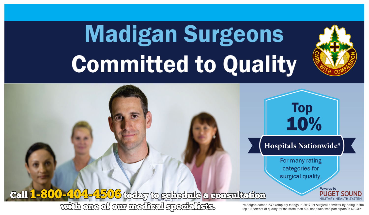 General, Thoracic, Colorectal, Pediatric, and Plastic Surgery services provides a comprehensive range of surgical and subspecialty surgical care. Our highly qualified surgeons provide expert consultative inpatient and outpatient healthcare services for patients suffering from a broad range of surgical illness and injury. In addition, our Plastic Surgery service provides cosmetic services in addition to reconstruction procedures. We aim to provide exceptional care for all of our patients through our state-of-the-art healthcare facilities, first-rate education, and research and process improvement programs. Our surgeons are trained at the leading academic programs and have advanced training in robotic surgery, minimally invasive procedures, and cutting edge techniques. We are a Commission on Cancer and Metabolic and Bariatric Surgery Accreditation and Quality Improvement Program accredited facility which highlights our commitment to excellent care. The Surgery Service at Madigan serves as a training vehicle for Madigan residents and interns as well as Uniformed Services University of the Health Sciences and Health Professions Scholarship Program medical students.