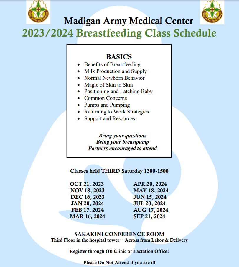 Madigan offers one prenatal breastfeeding classes, a 2-hour Basics class. These classes cover information that every mother/couple should know who plans to breastfeed.